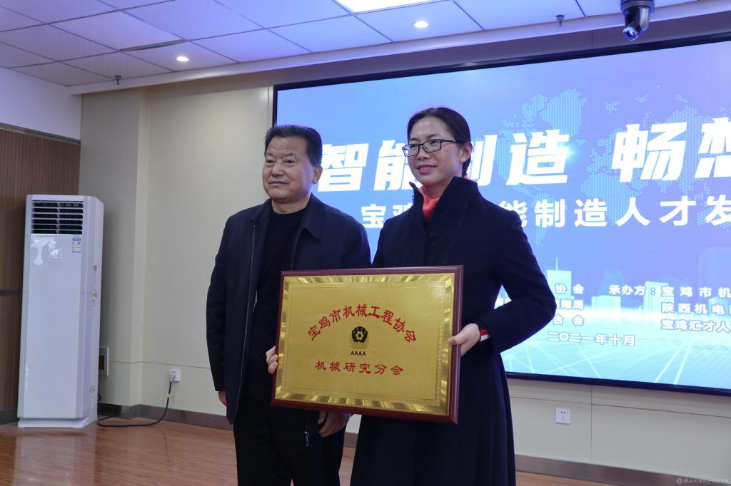 市机械工程协会秘书长王福利宣读了关于在陕西机电职业技术学院设立宝鸡市机械工程协会机械研究分会的决定,市机械工程协会会长何志科为陕西机电职业技术学院授牌,机械研究分会成立后,借助陕西机电职业技术学院科研优势,协助解决企业管理及发展中的技术难题,助力企业科研开发,促进企业发展有着重要作用。