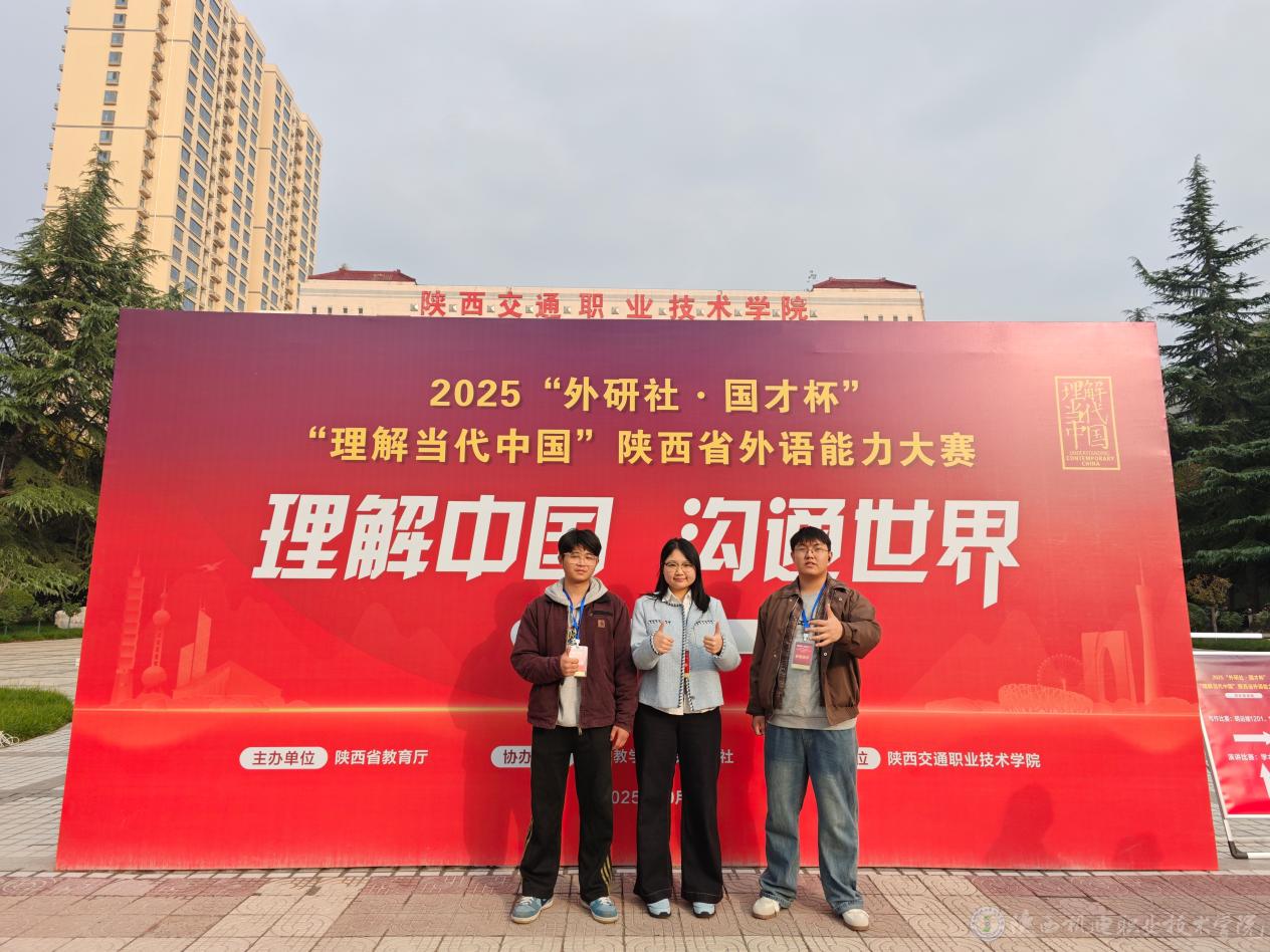 10月25日至26日,2025“外研社·国才杯”“理解当代中国”陕西省外语能力大赛(高职组)在陕西交通职业技术学院盛大举行。陕西机电职业技术学院24大数据2班蒋璐微(指导教师:王春宁)荣获写作赛项一等奖,24机械制造2班穆向阳(指导教师:周毅)和23机电技术2班杨灿(指导教师:宋冰心)双双荣获写作赛项三等奖。