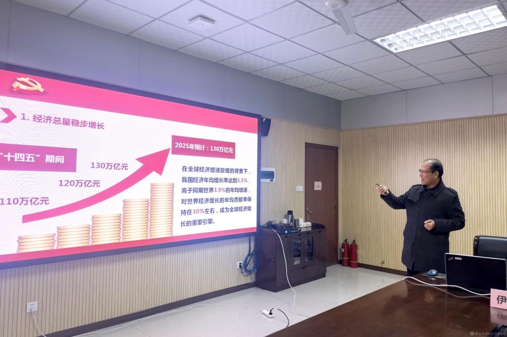 伊逊智以《党建引领勇担使命奋力推动学校事业高质量发展》为主题,从全面学习贯彻党的二十届四中全会精神、以政治建设为统领把牢学院事业发展的“定盘星”、以责任担当为核心 夯实党建引领发展的“压舱石”、以实干笃行为导向 激活高质量发展的“动力源”四个方面,为参会人员作了专题辅导和深入解读。